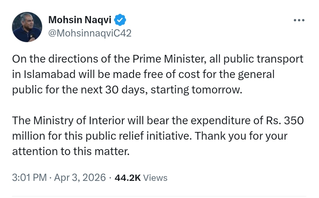 Additionally, Interior Minister Mohsin Naqvi confirmed on X that all public transport in Islamabad will be free of charge for the next 30 days, starting Saturday, in line with the federal government’s relief measures.