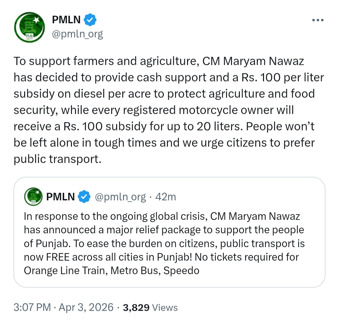 Punjab Chief Minister Maryam Nawaz described this as a major relief measure amid the ongoing global crisis and part of the national savings and austerity programme initiated by Prime Minister Shehbaz Sharif. She also highlighted cash support for farmers, including a diesel subsidy of Rs100 per litre per acre and a Rs100 per 20 litres subsidy for registered motorcycle owners.