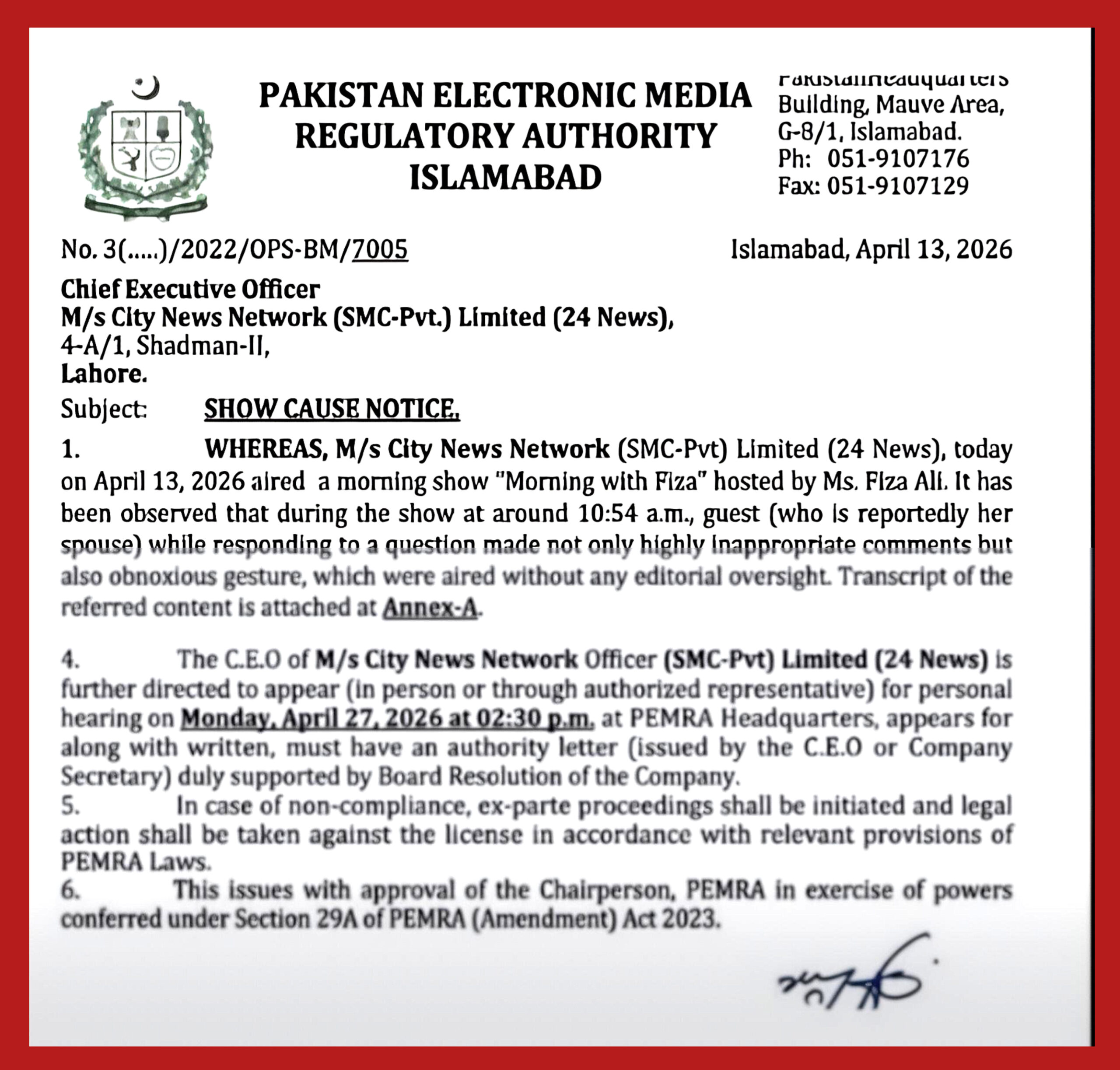 According to the notice, the CEO of M/s City News Network (SMC-Pvt) Limited has been directed to appear for a personal hearing at PEMRA Headquarters on Monday, April 27, 2026, at 2:30 p.m. The regulator warned that legal action will be taken against the channel’s license under relevant PEMRA laws if the CEO fails to comply.
