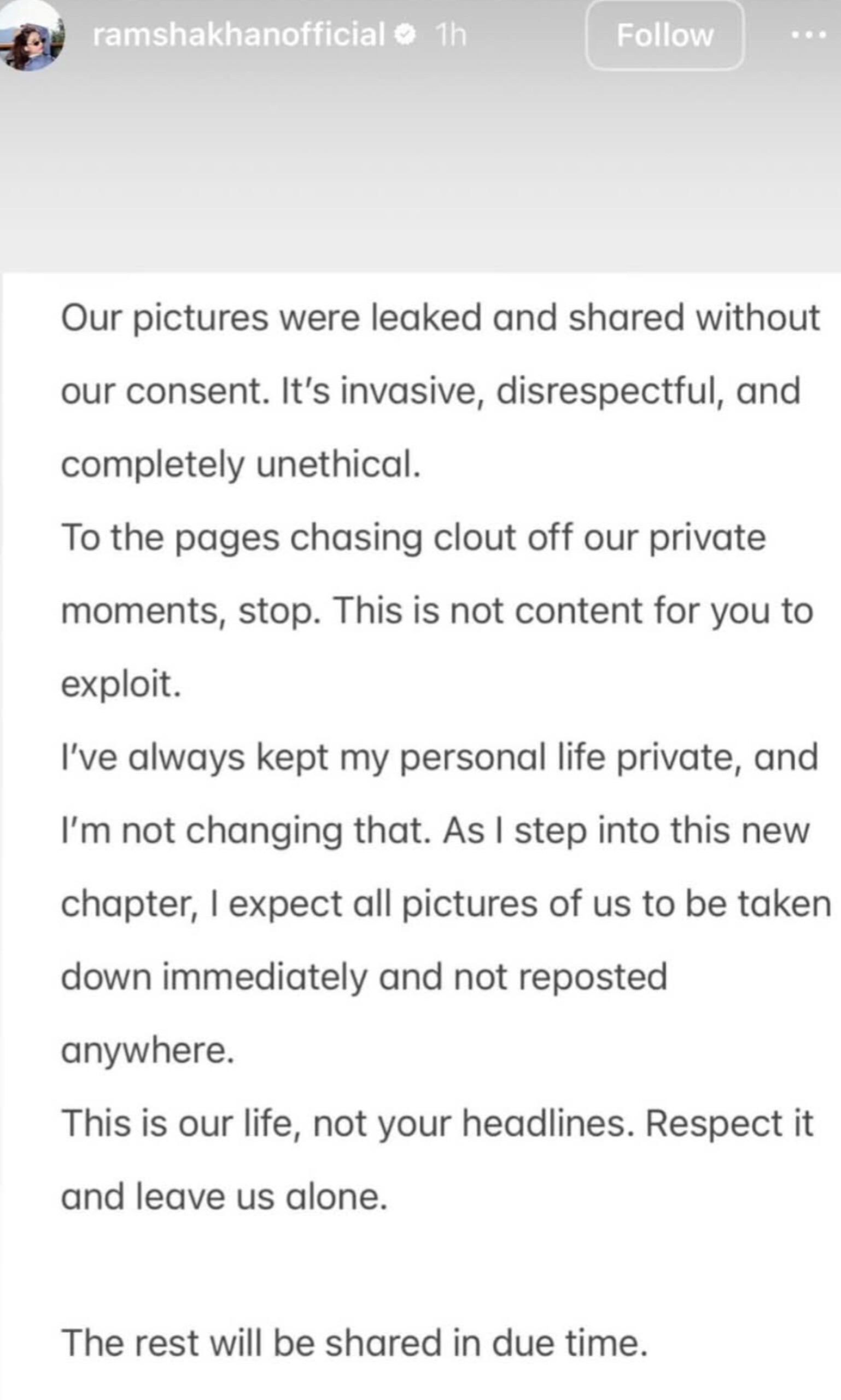 Ramsha Khan further stated that as she begins a new chapter in her life, she expects her privacy to be respected. She clearly called for all unauthorized images from the event to be taken down, highlighting her right to control what aspects of her personal life are shared publicly.