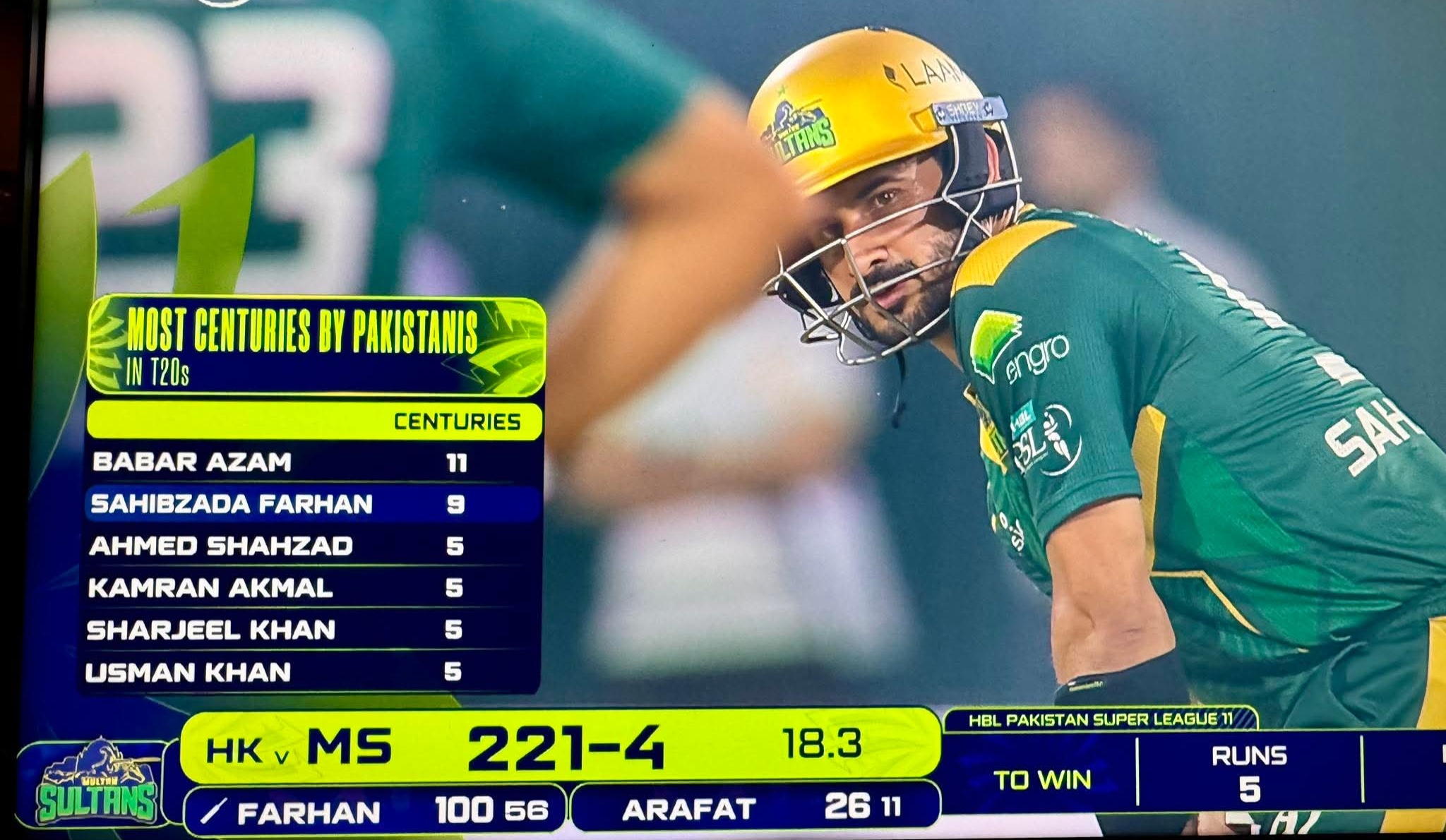 In a thrilling encounter Multan Sultans chased down a daunting target of 225 against Hyderabad Kingsmen, reaching the total in the 19th over thanks to Sahibzada Farhan, who scored a brilliant 106 off just 57 balls.